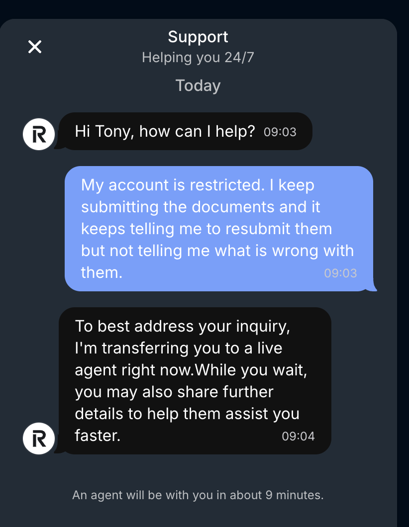 Their live chat is hidden behind several layers of help. When you get there, they put you on to someone with a 10 minute wait time. This person is actually helpful this time, and says they can't see the document I uploaded last week. I re-upload the document. They say it should be solved in a few hours.