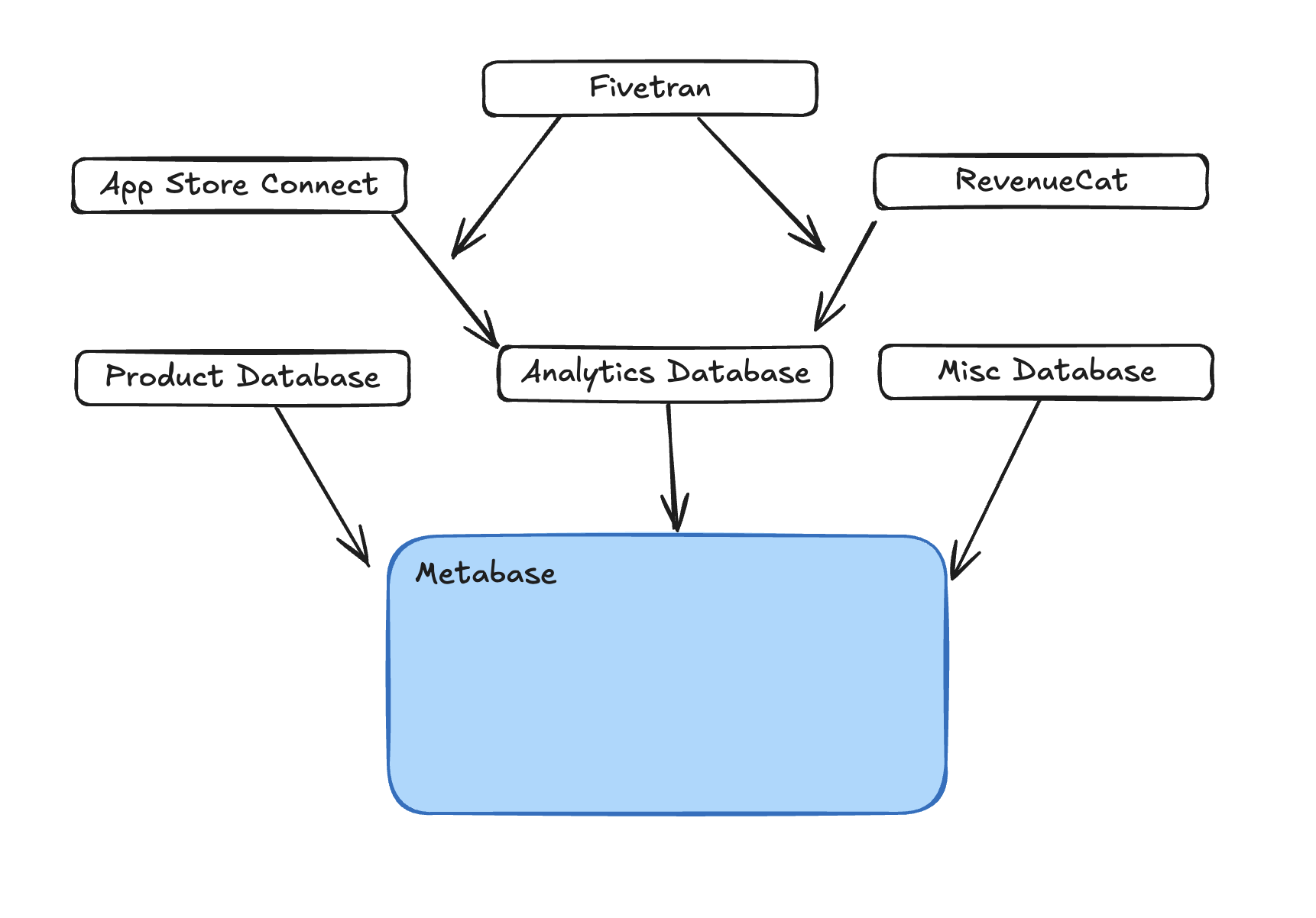 Analytics Database: This is a postgres database we created solely to pipe data into using Fivetran, so that we could get our App Store Connect data in postgres.